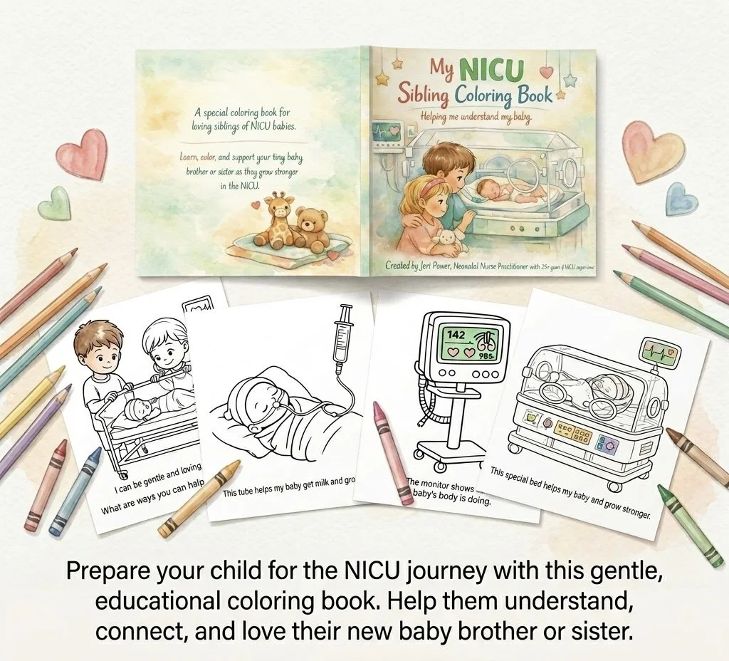 when a baby is in the NICU, the whole family feels it - including the siblings at home trying to make sense of something no child should have to navigate alone. This coloring book was created specifically for NICU siblings, giving them a gentle, age-appropriate way to process their feelings, stay connected to their new baby, and feel included int he journey. A meaningful gift for any family in the NICU - and a beautiful keepsake long after they come home.